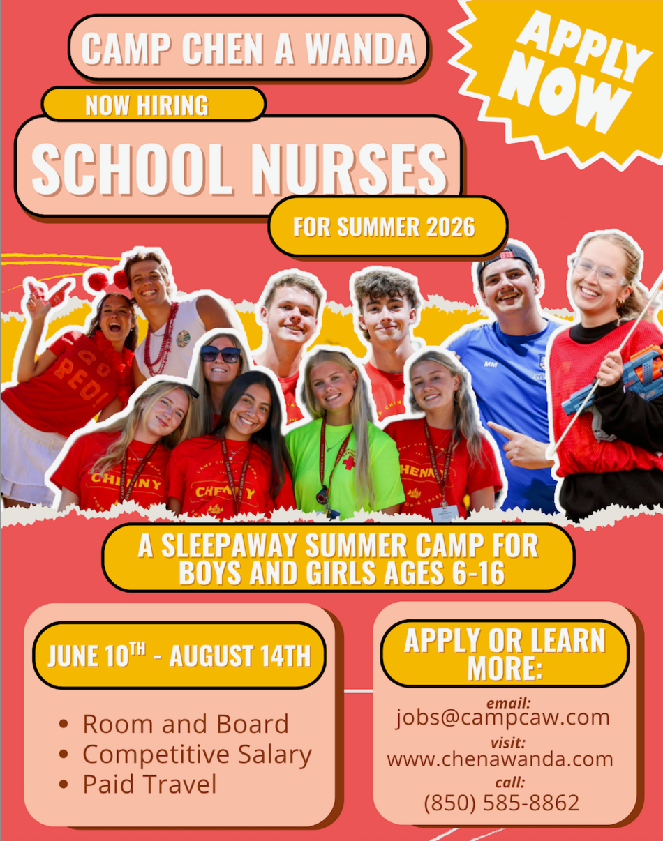 Camp CHEN-A-WANDA is looking for nurses to join our team for the 2026 summer! Our Nurses experience the adventure of a lifetime working for one of the country's most prestigious sleep-away Summer camps, Camp CHEN-A-WANDA